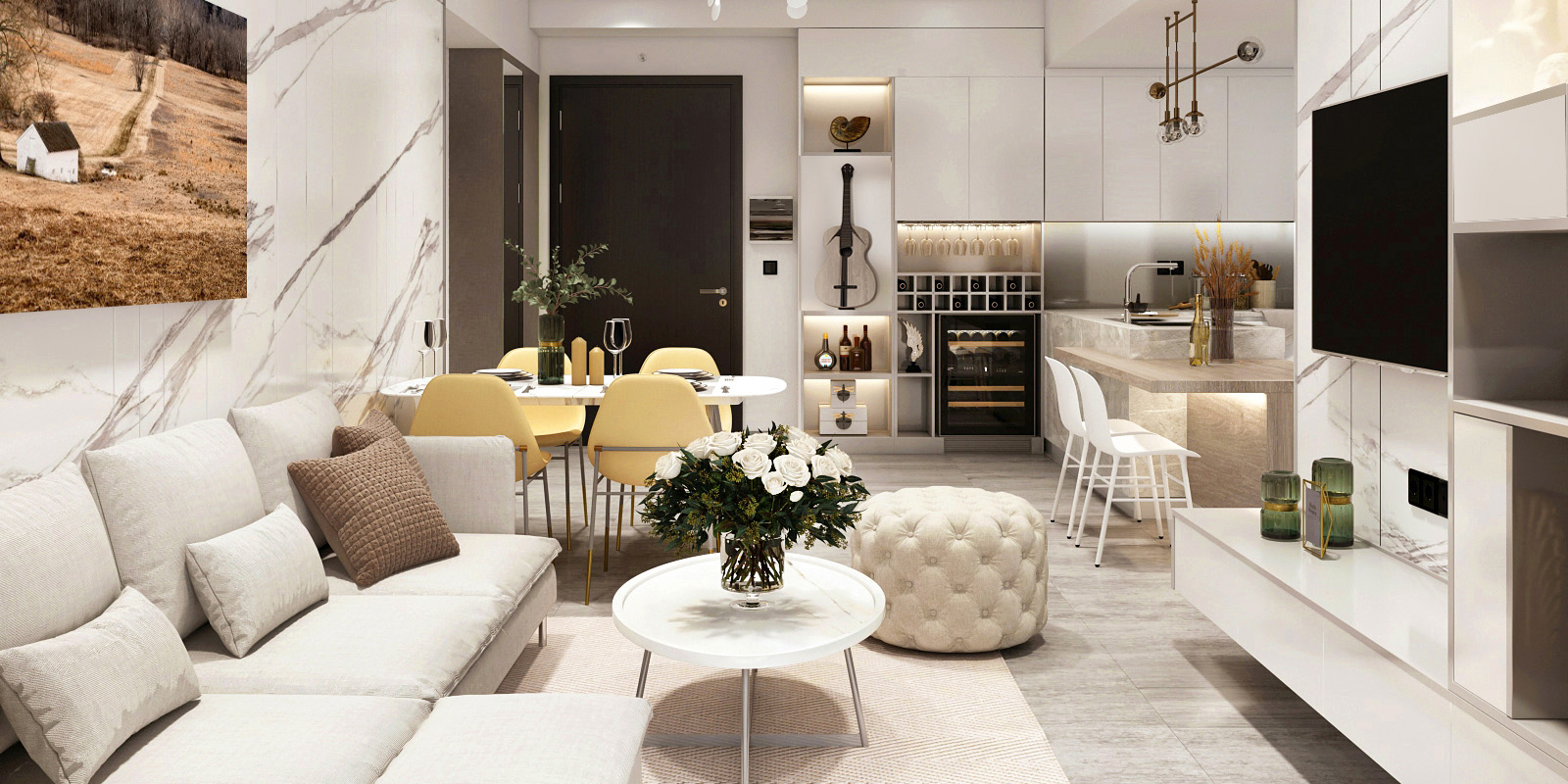 Nhằm mang đến không gian sống đẹp mắt, tiện nghi cho gia chủ, các kiến trúc sư của Woodsense đã khéo léo trong cách lựa chọn các vật dụng nội thất. Căn hộ được ốp bằng chất liệu gỗ cao cấp tạo nên sự tương phản cuốn hút cho toàn bộ không gian. Thêm vào đó là việc sử dụng hệ thống cửa kính lớn thay thế cho những bức tường gạch truyền thống. Thiết kế này giúp căn hộ có thể tận dụng được tối đa ánh sáng tự nhiên và kết nối hài hòa với không gian thiên nhiên bên ngoài.
