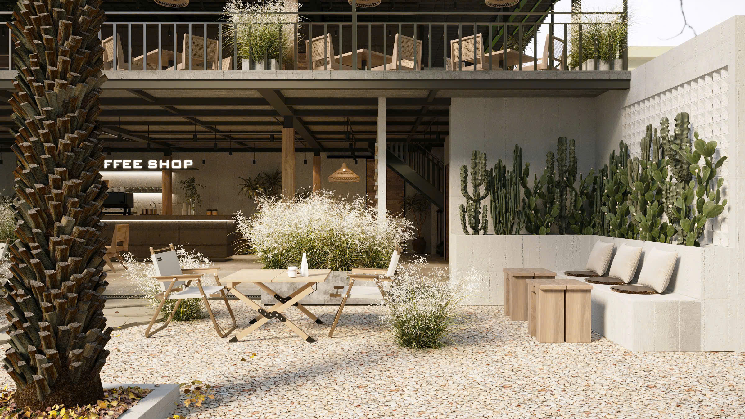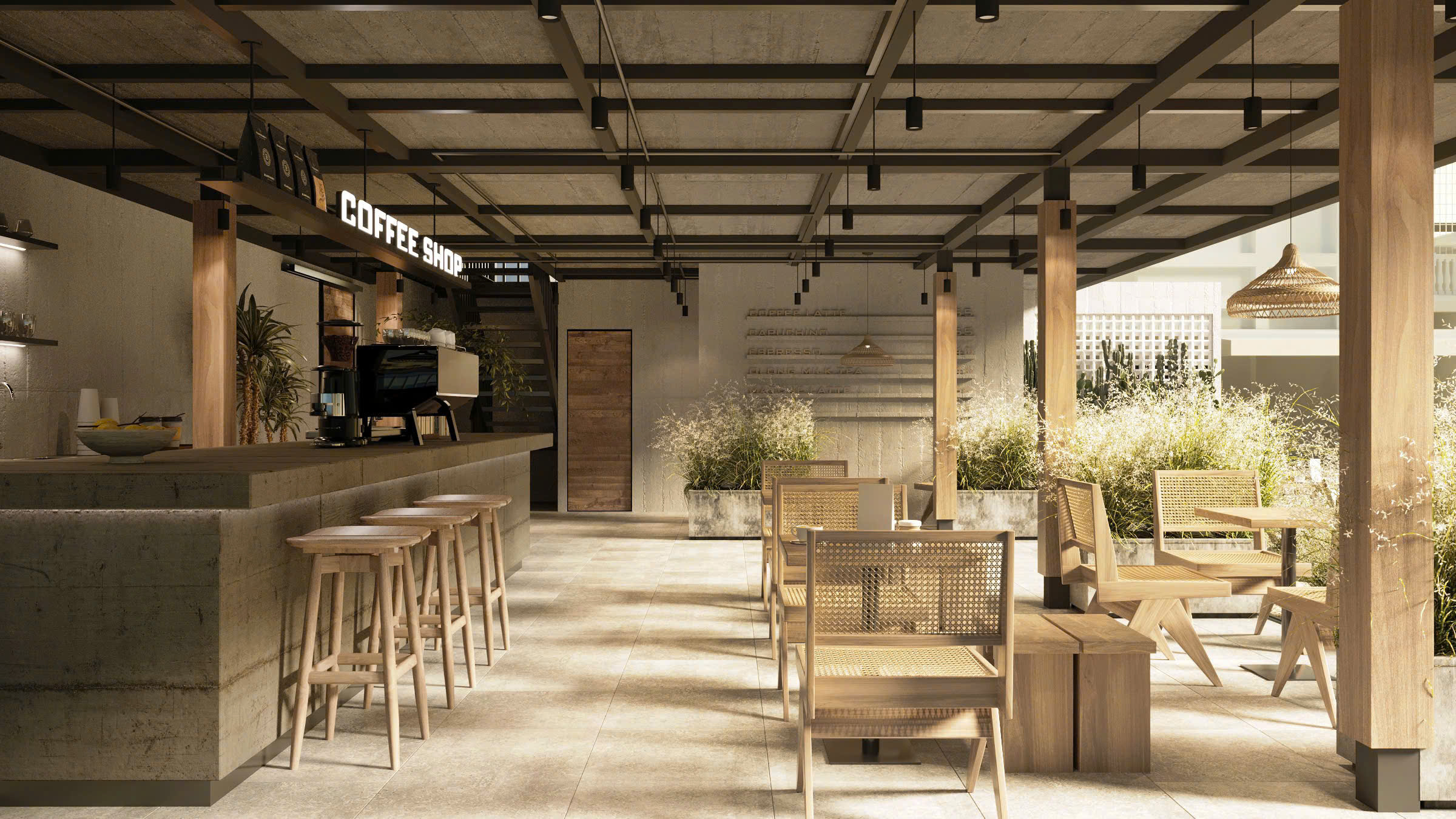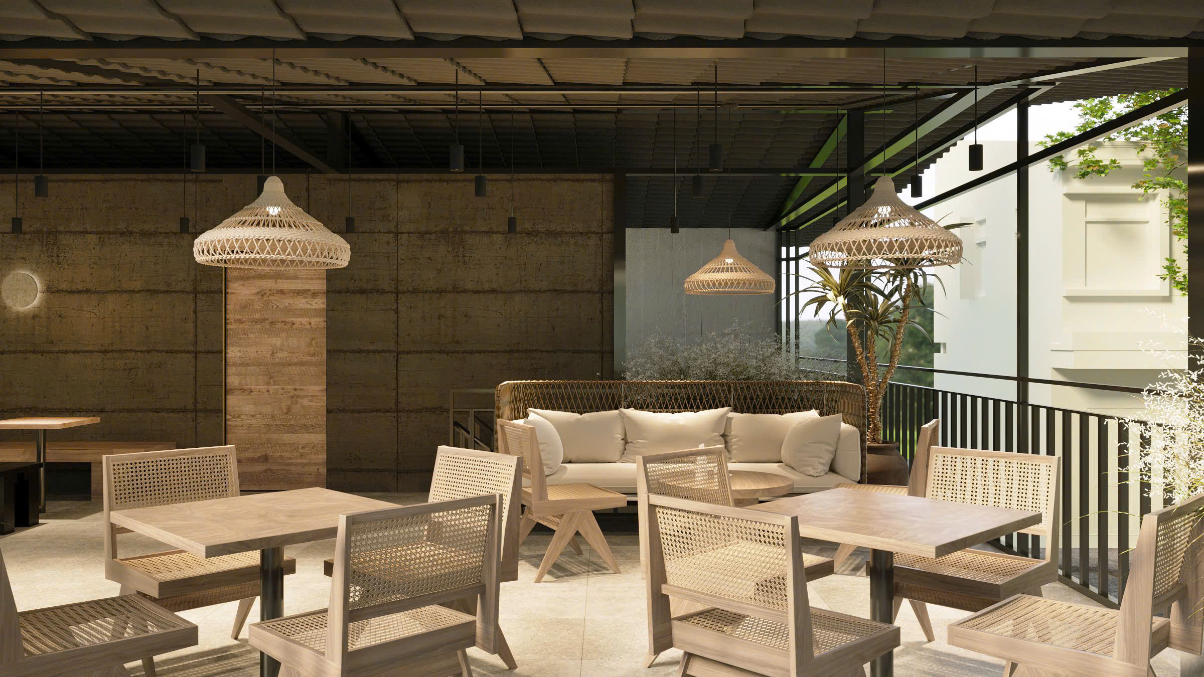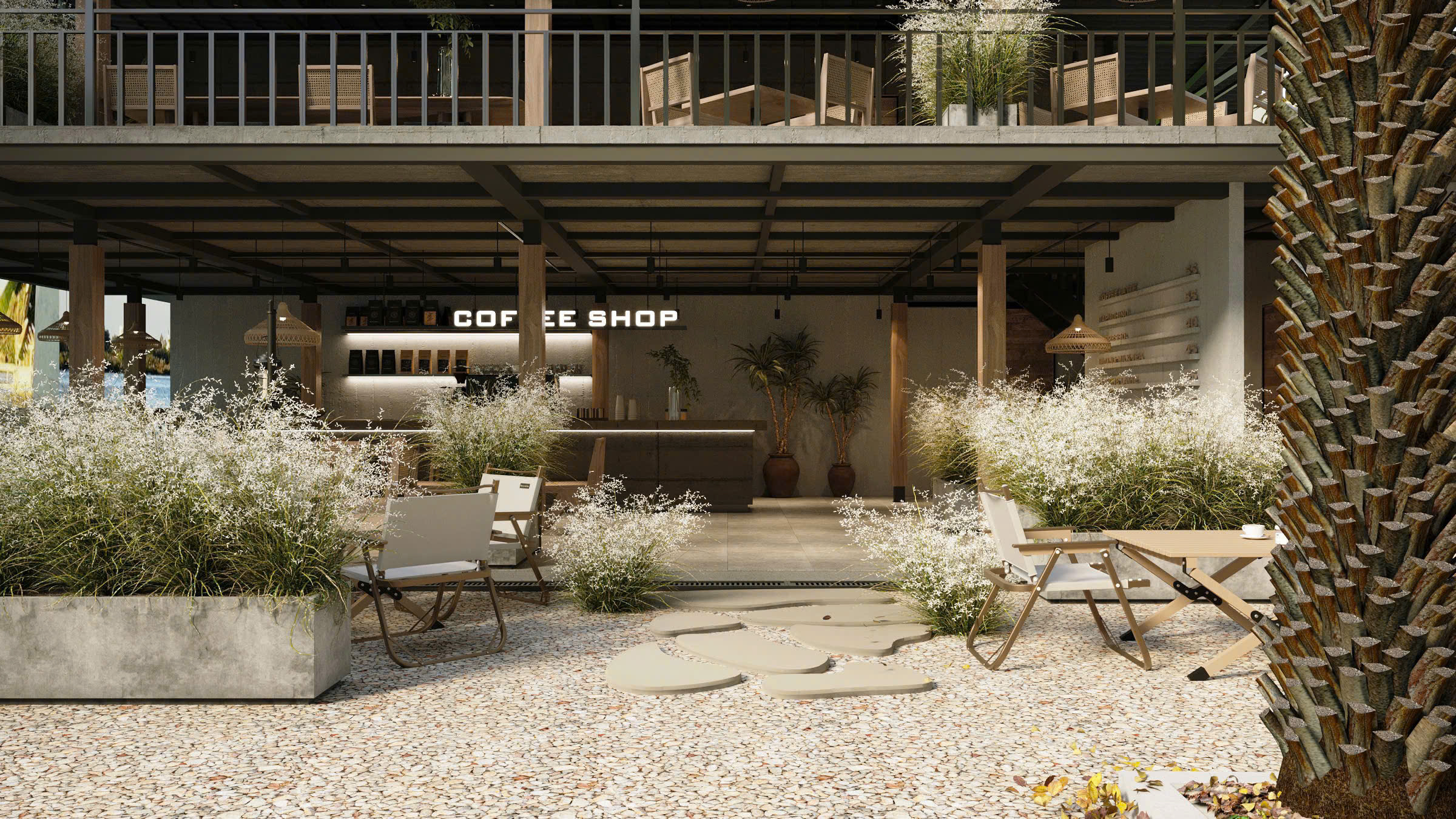 Thiết kế quán cà phê hướng đến không gian mở, tạo cảm giác gần gũi và thư giãn cho khách hàng. Với sự kết hợp giữa vật liệu tự nhiên như gỗ, gạch, và các mảng xanh, công trình mang lại bầu không khí trong lành, nhẹ nhàng và thoáng đãng.