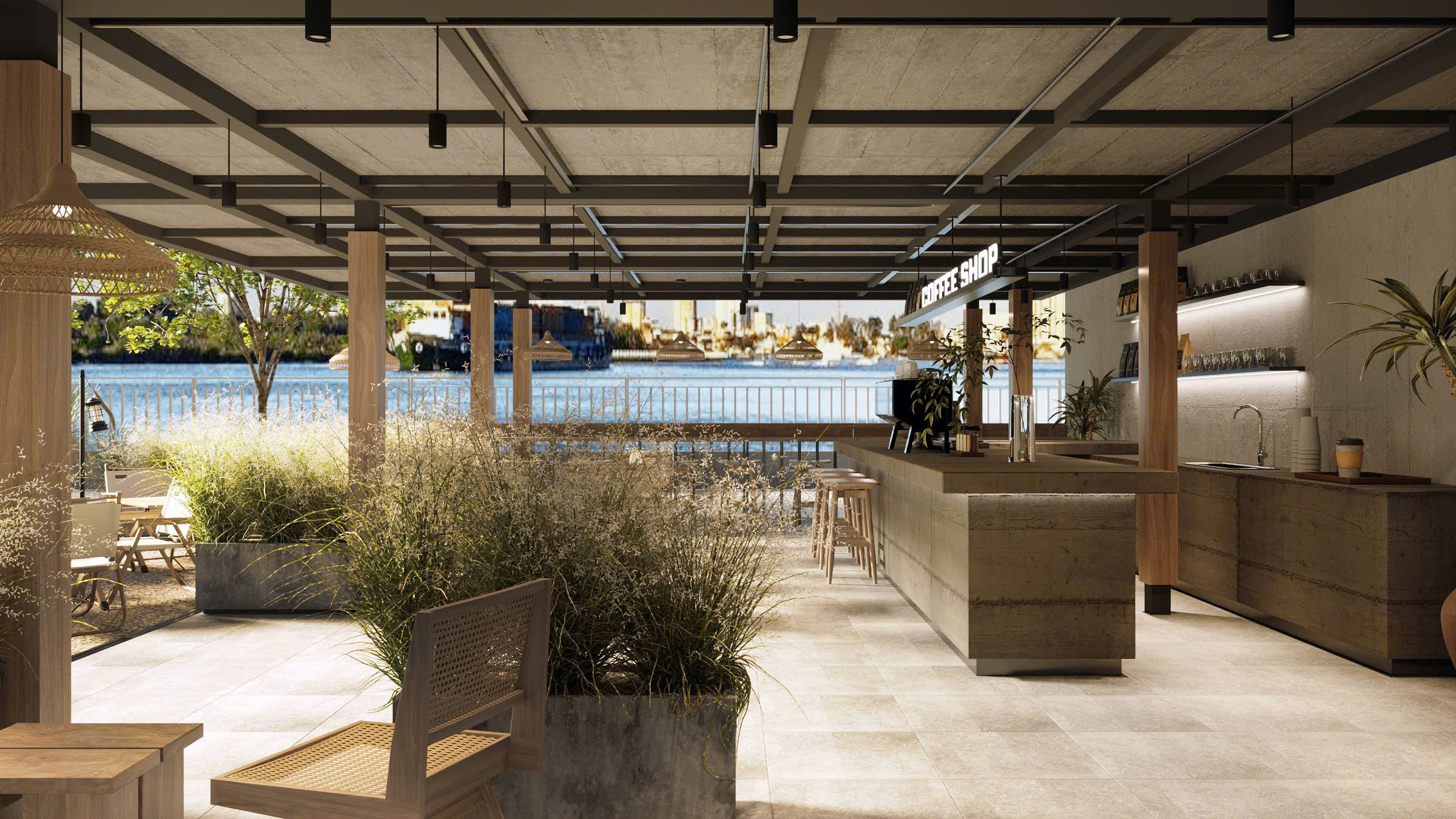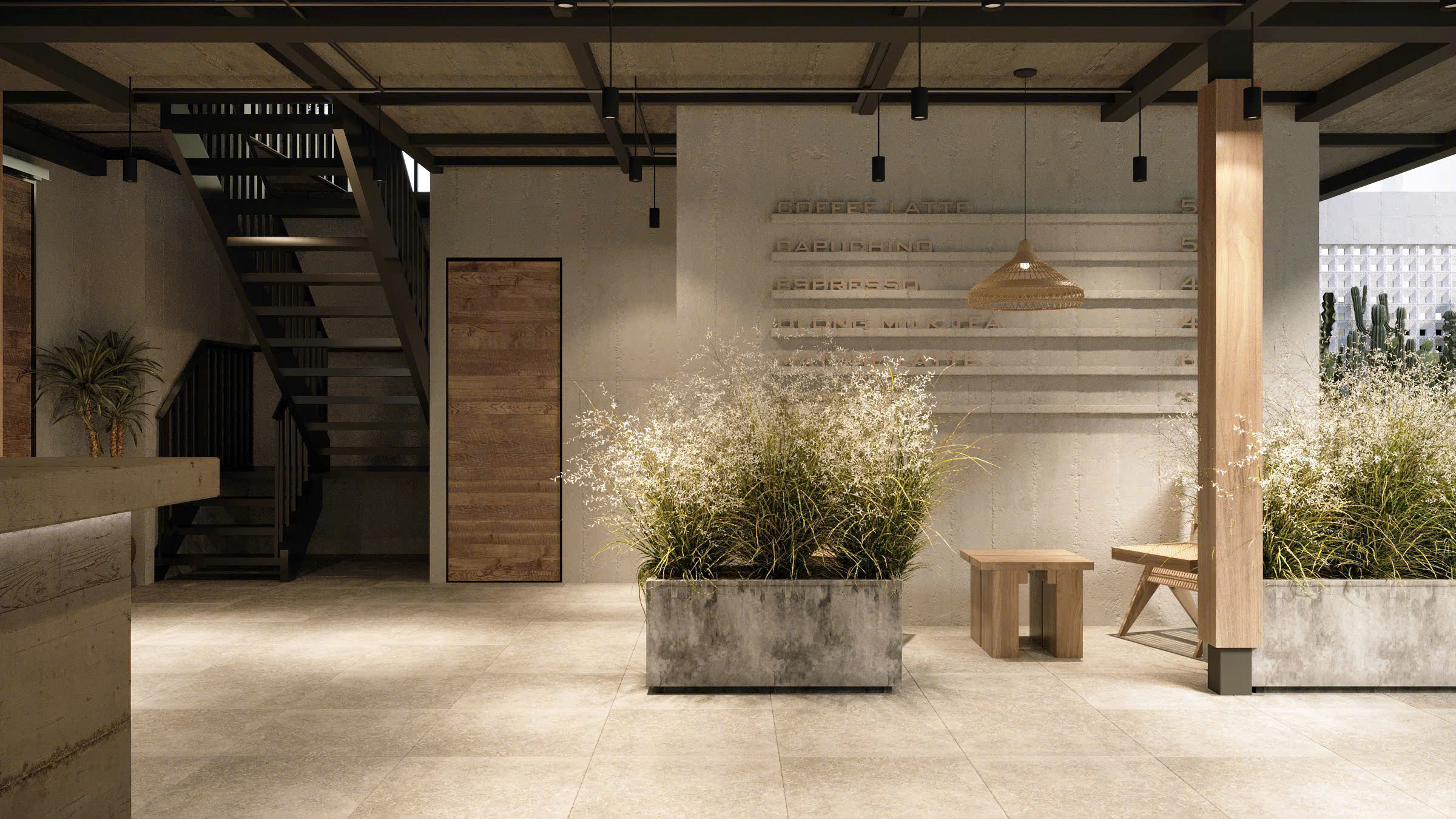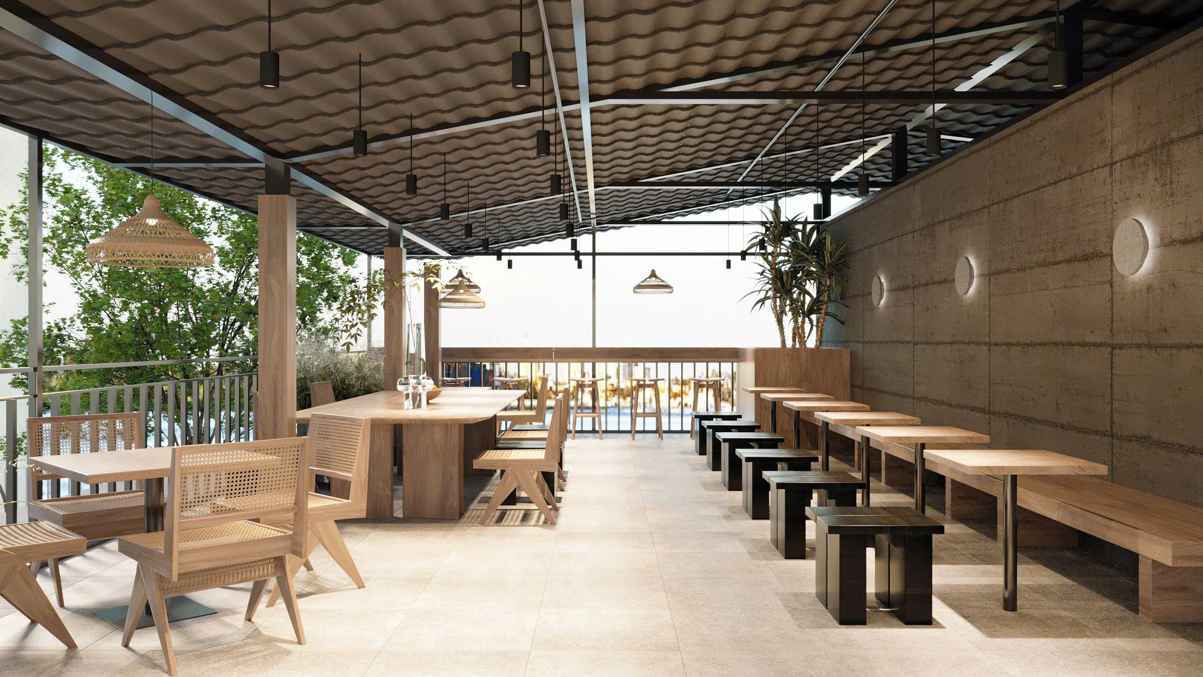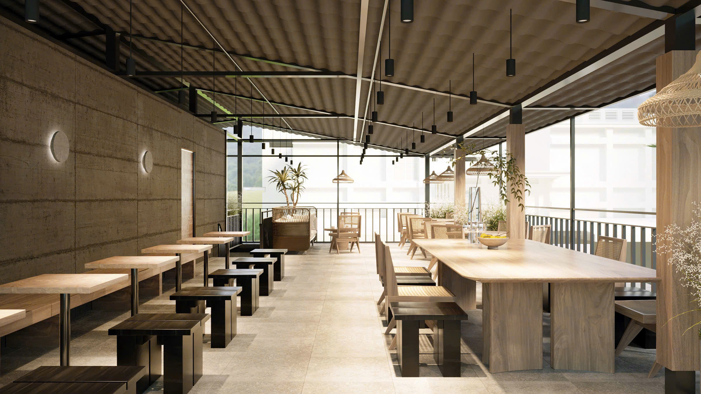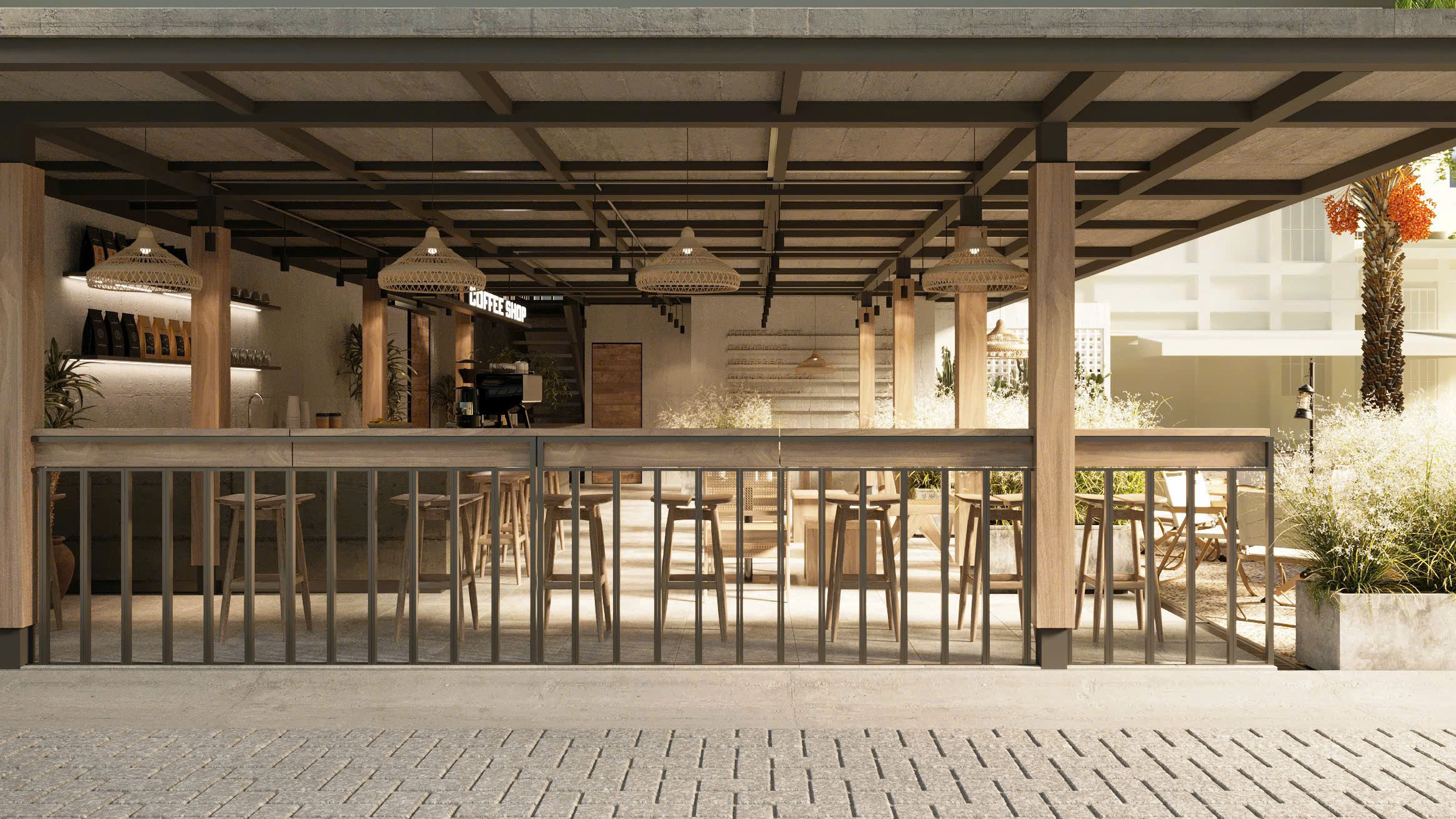 Thiết kế quán cà phê hướng đến không gian mở, tạo cảm giác gần gũi và thư giãn cho khách hàng. Với sự kết hợp giữa vật liệu tự nhiên như gỗ, gạch, và các mảng xanh, công trình mang lại bầu không khí trong lành, nhẹ nhàng và thoáng đãng.