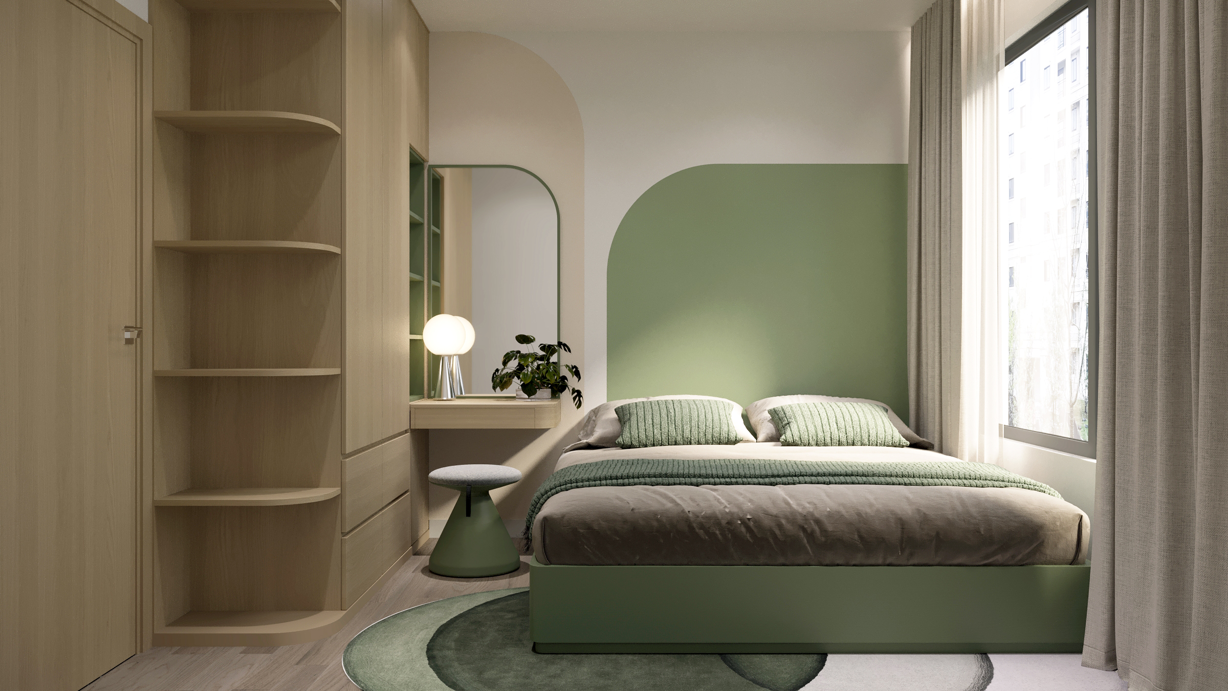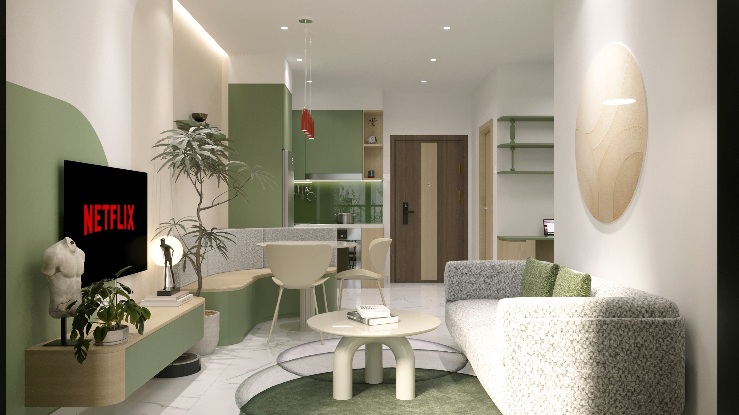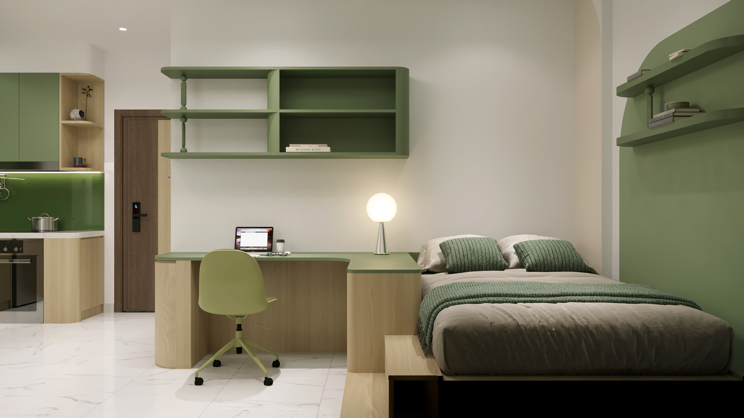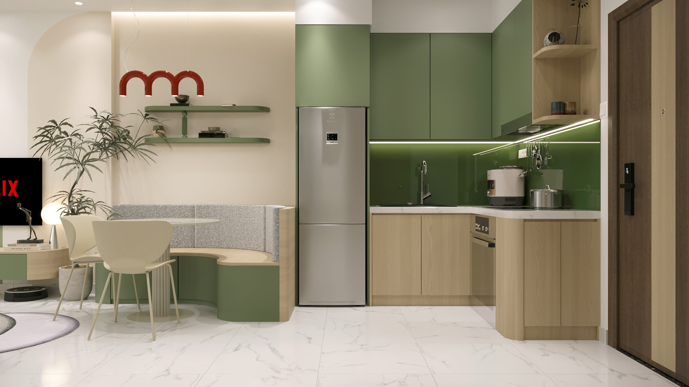 Một căn hộ nhỏ nhưng được chăm chút để đủ đầy cảm xúc. Woodsense lựa chọn bảng màu xanh olive kết hợp cùng gỗ sáng làm chủ đạo, nhấn mạnh các đường cong mềm và ánh sáng dịu, tạo nên một không gian sống nhẹ nhàng, ấm áp và có chiều sâu.
