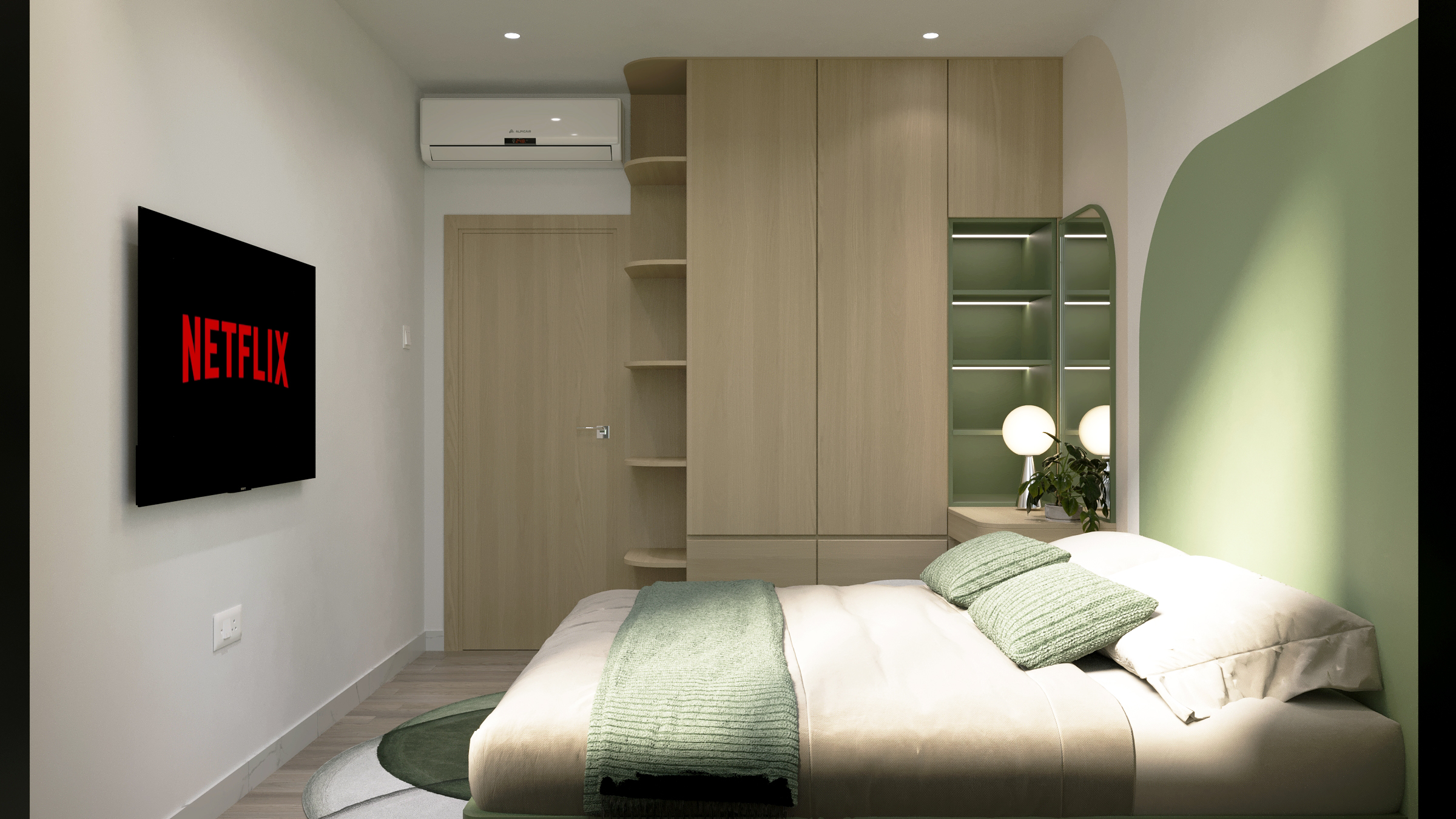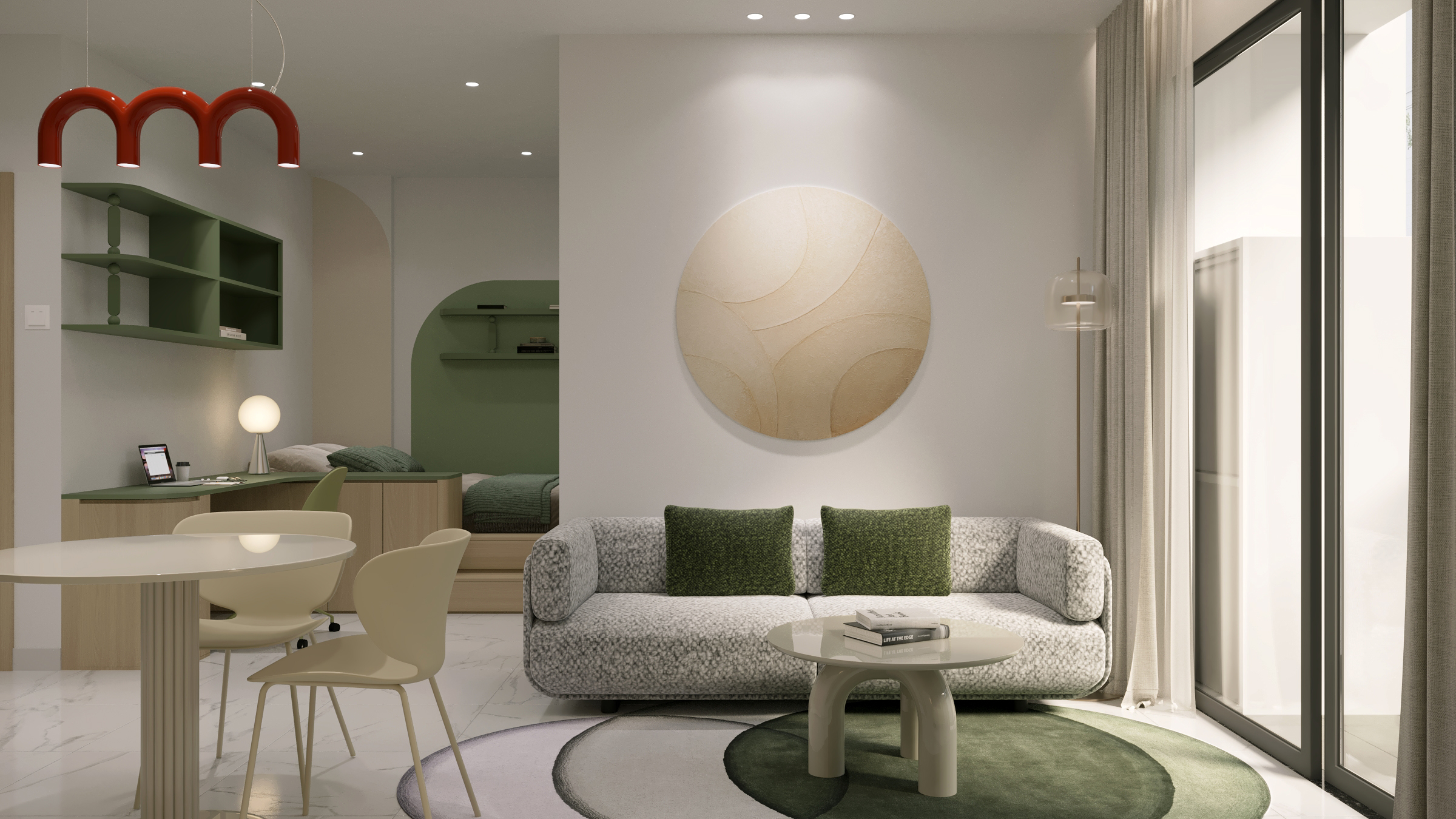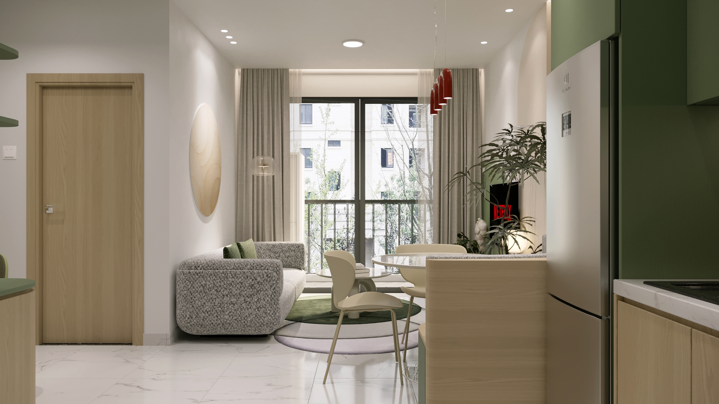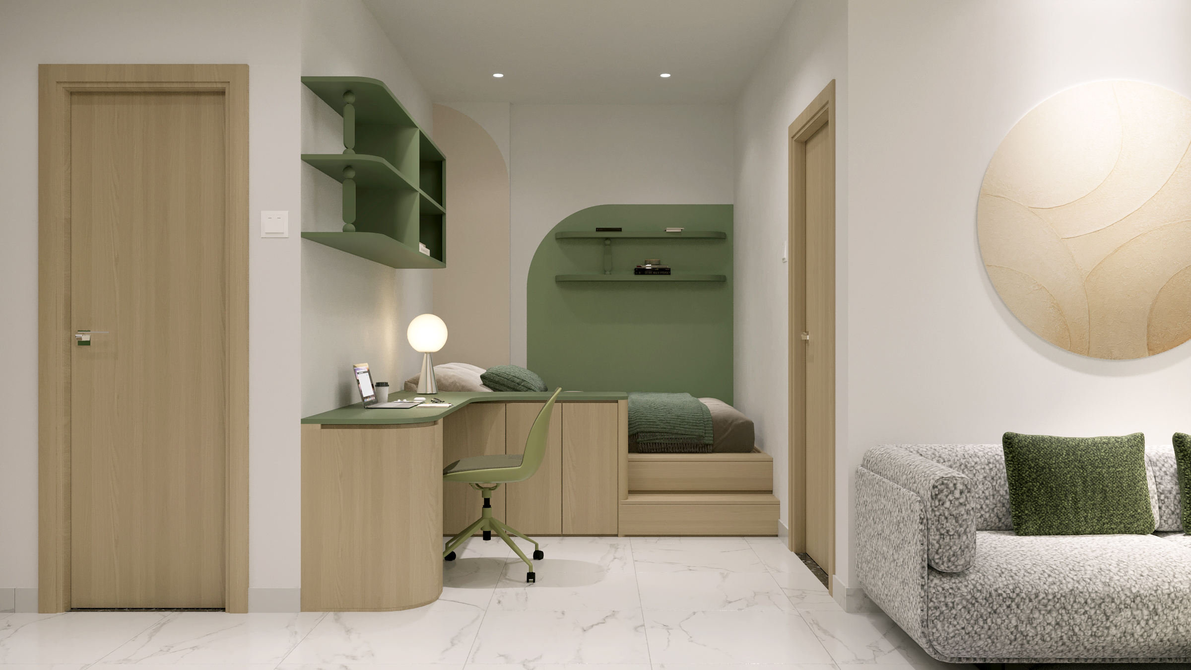 Một căn hộ nhỏ nhưng được chăm chút để đủ đầy cảm xúc. Woodsense lựa chọn bảng màu xanh olive kết hợp cùng gỗ sáng làm chủ đạo, nhấn mạnh các đường cong mềm và ánh sáng dịu, tạo nên một không gian sống nhẹ nhàng, ấm áp và có chiều sâu.