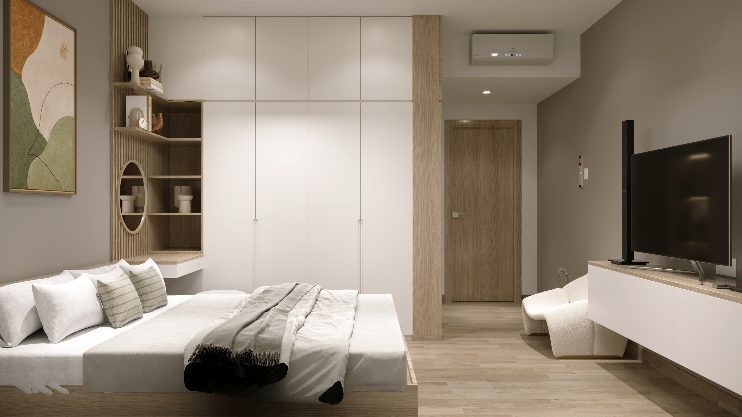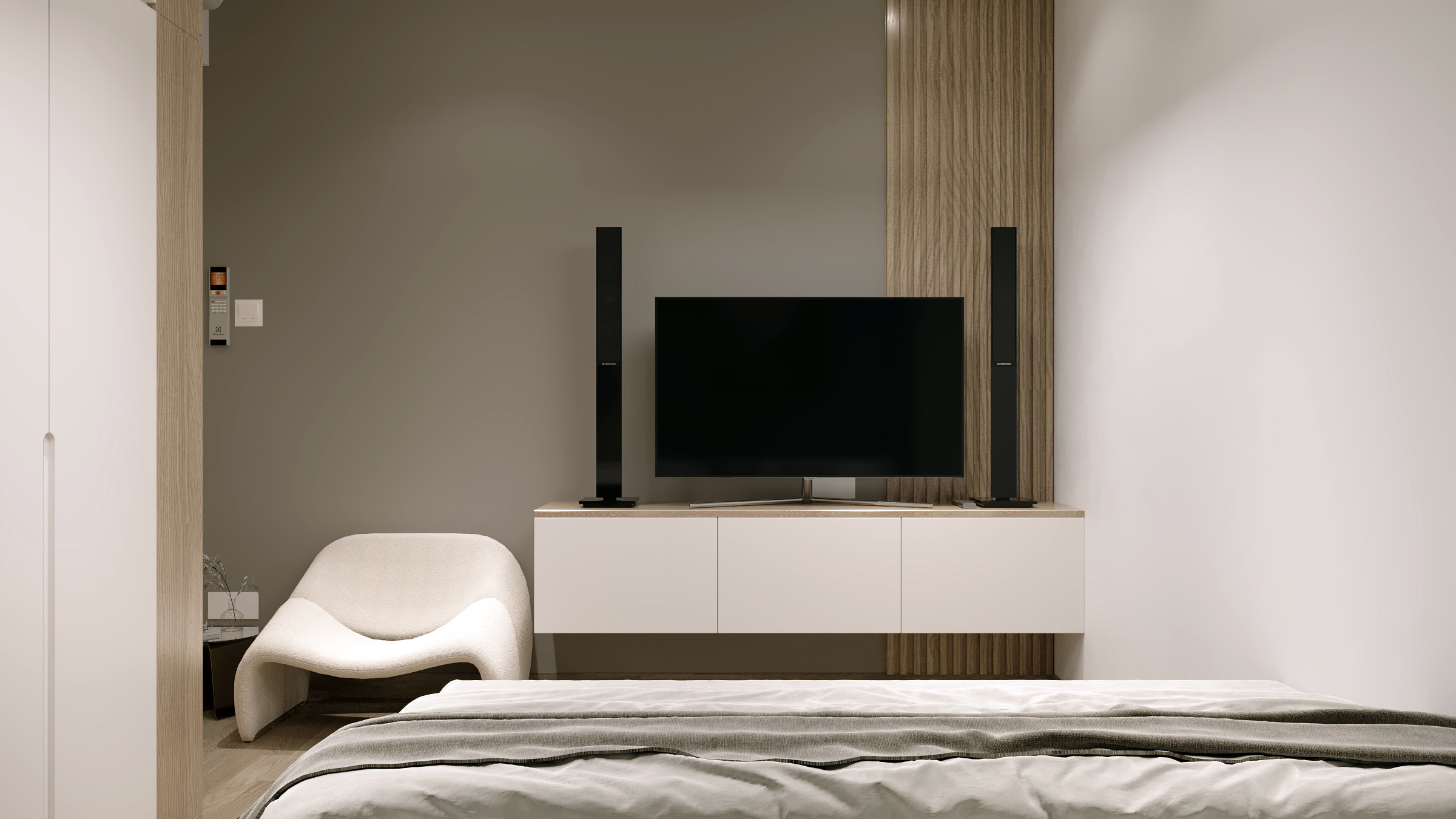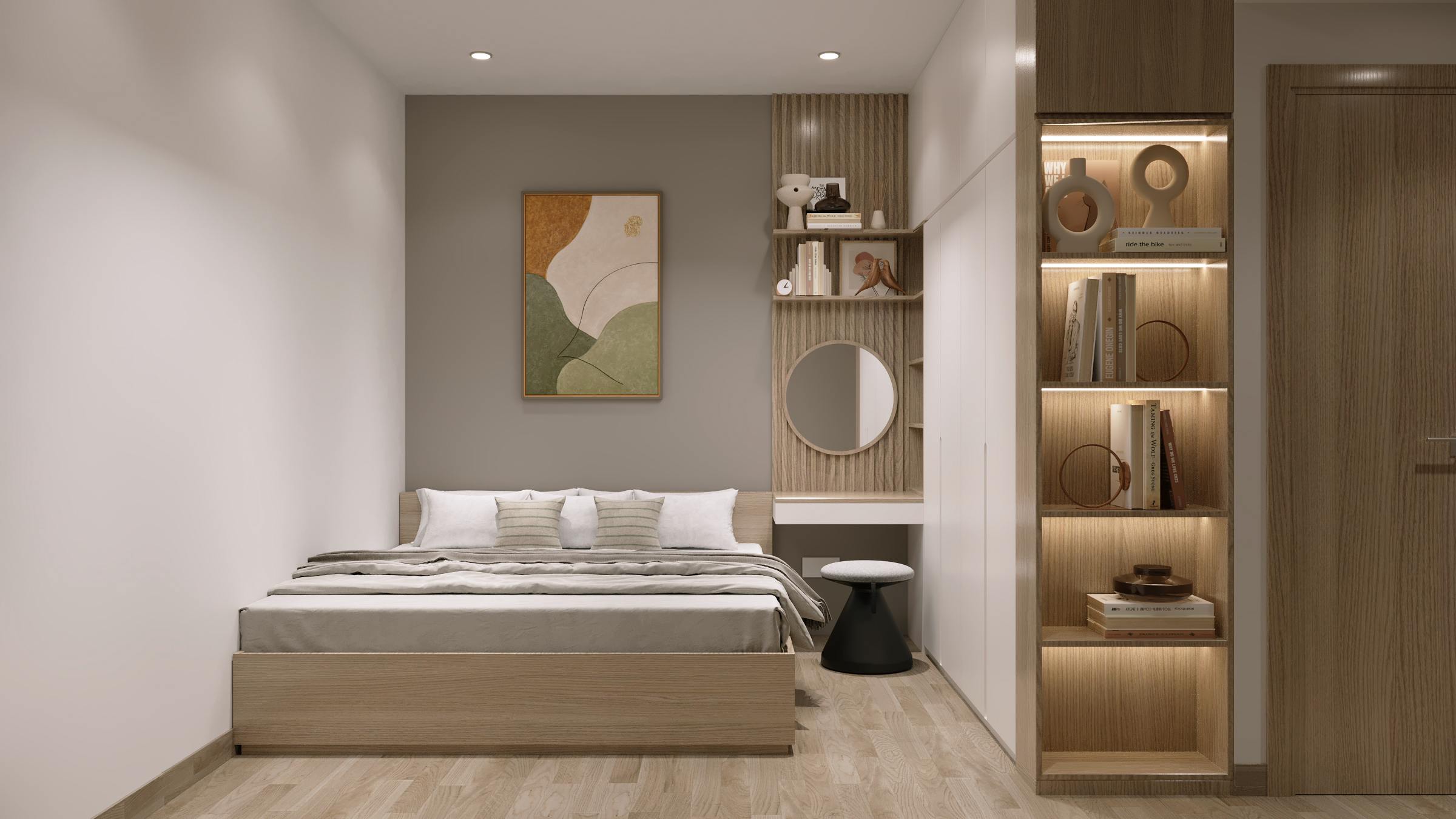 Từng chi tiết được đội ngũ Woodsense chăm chút kỹ lưỡng: từ hệ tủ bếp phẳng tinh tế, phòng ngủ tông màu trung tính nhẹ nhàng, đến kệ trang trí và ánh sáng hắt LED đầy tinh tế.